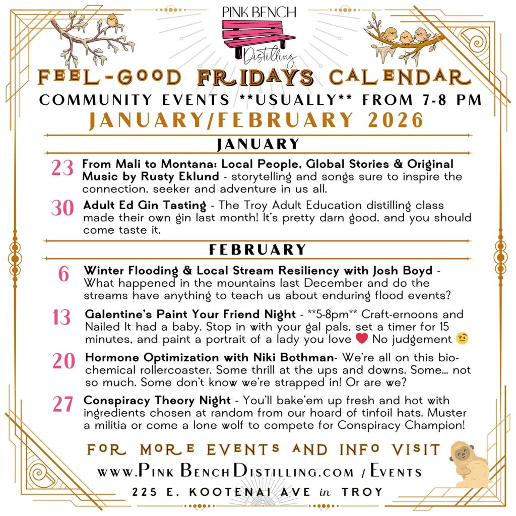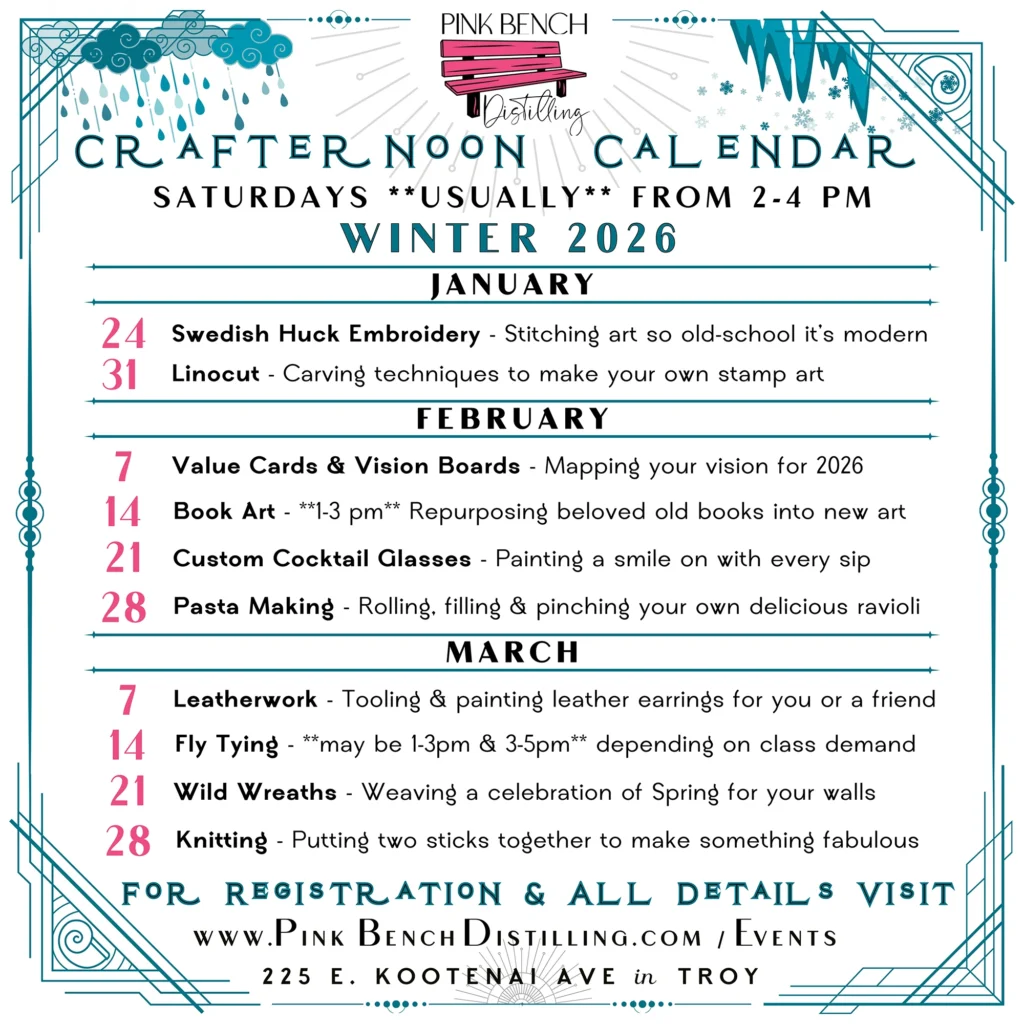 Check out our calendar to see what’s coming up at Pink Bench Distilling, and scroll down to learn more about each event as well as sign-up online for our crafter-noon gatherings.